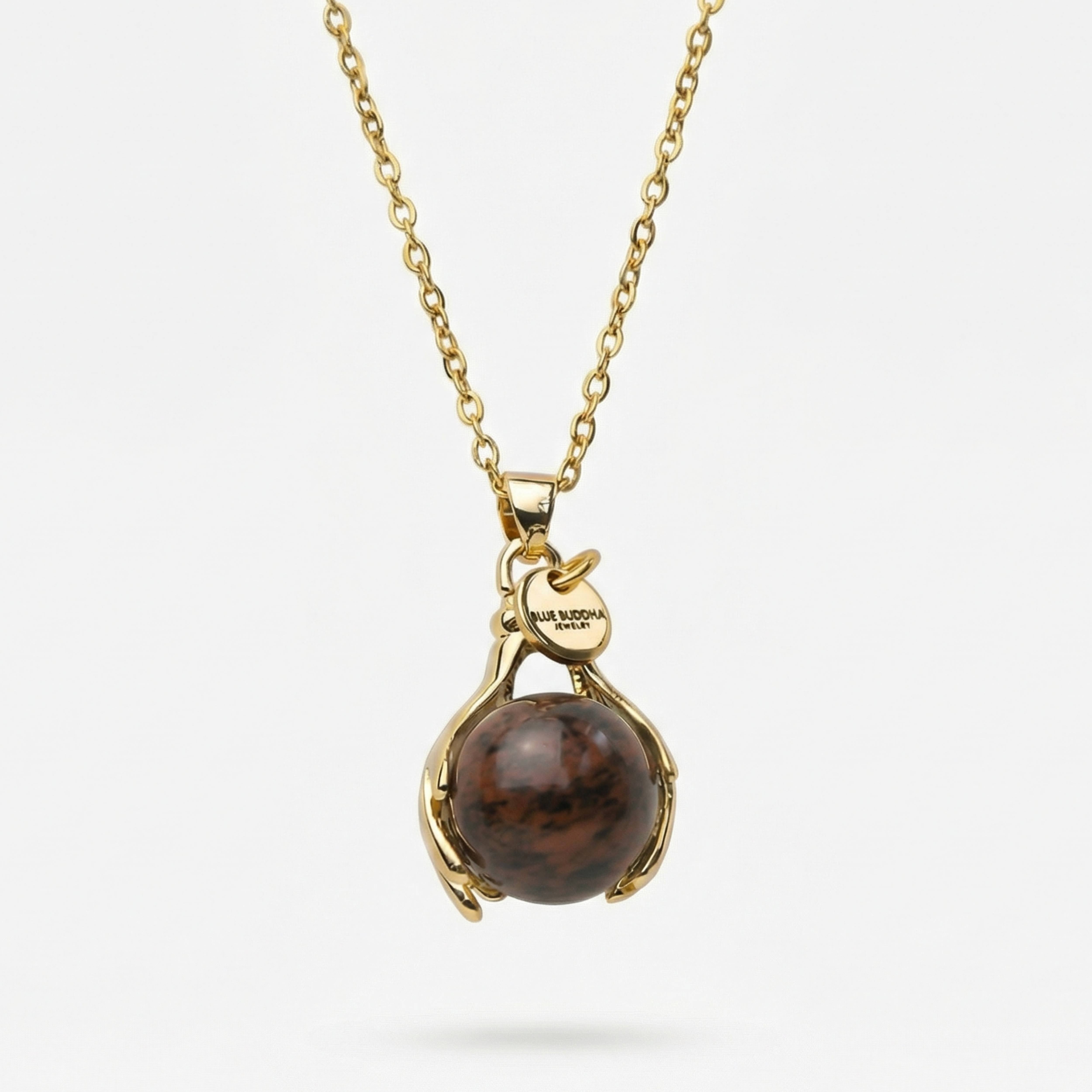 Mahagoni-Obsidian , gehalten in einem zarten, handförmigen Anhänger, dient als tägliche Erinnerung daran, geerdet und geschützt zu bleiben.